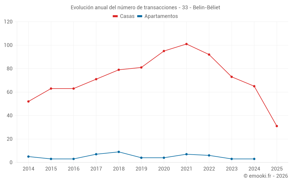 El precio mediano en las 31 transacciones de casas de los últimos 6 meses en la comuna de Belin-Béliet fue de 2 640 € por metro cuadrado para un valor patrimonial medio de 254 000 €. Durante este período el 60% de las transacciones estuvieron entre 2 232 y 3 119 € por metro cuadrado (del 2º al 8º decil).