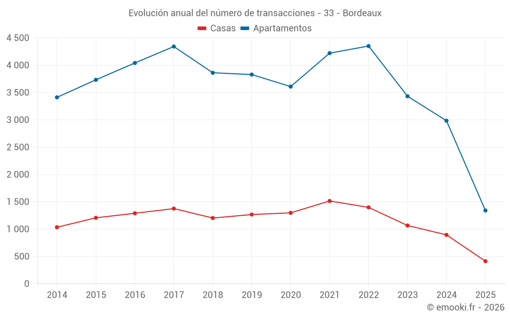 El precio mediano en las 590 transacciones de apartamentos de los últimos 3 meses en la comuna de Bordeaux fue de 4 086 € por metro cuadrado para un valor patrimonial medio de 204 000 €. Durante este período el 60% de las transacciones estuvieron entre 3 224 y 5 000 € por metro cuadrado (del 2º al 8º decil).