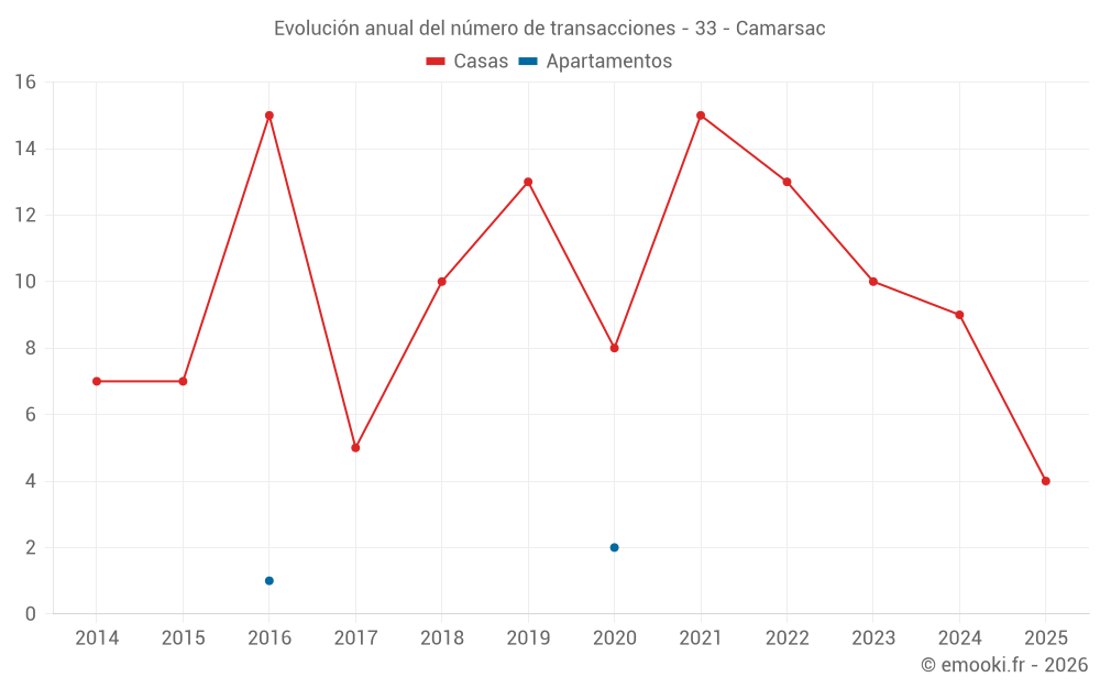 El precio mediano en las 19 transacciones de casas de los últimos 24 meses en la comuna de Camarsac fue de 2 782 € por metro cuadrado para un valor patrimonial medio de 257 400 €. Durante este período el 60% de las transacciones estuvieron entre 2 163 y 3 031 € por metro cuadrado (del 2º al 8º decil).
