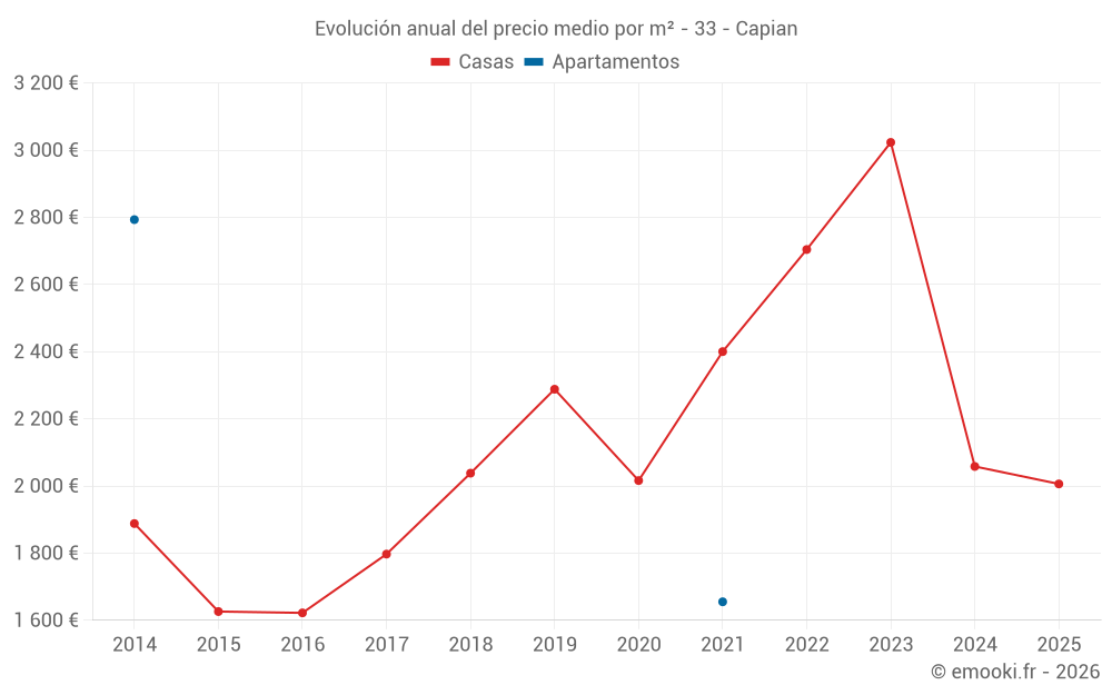 El precio por m² de las casas ha disminuido un 34% desde 2 años, pero ha aumentado un 24% en 9 años.