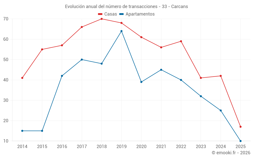 El precio mediano en las 22 transacciones de apartamentos de los últimos 12 meses en la comuna de Carcans fue de 3 826 € por metro cuadrado para un valor patrimonial medio de 148 765 €. Durante este período el 60% de las transacciones estuvieron entre 3 535 y 5 104 € por metro cuadrado (del 2º al 8º decil).