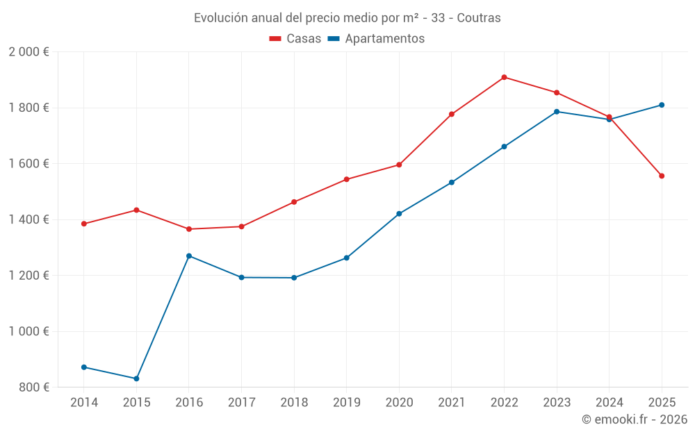 El precio mediano en las 37 transacciones de apartamentos de los últimos 24 meses en la comuna de Coutras fue de 1 716 € por metro cuadrado para un valor patrimonial medio de 81 300 €. Durante este período el 60% de las transacciones estuvieron entre 1 517 y 1 914 € por metro cuadrado (del 2º al 8º decil).