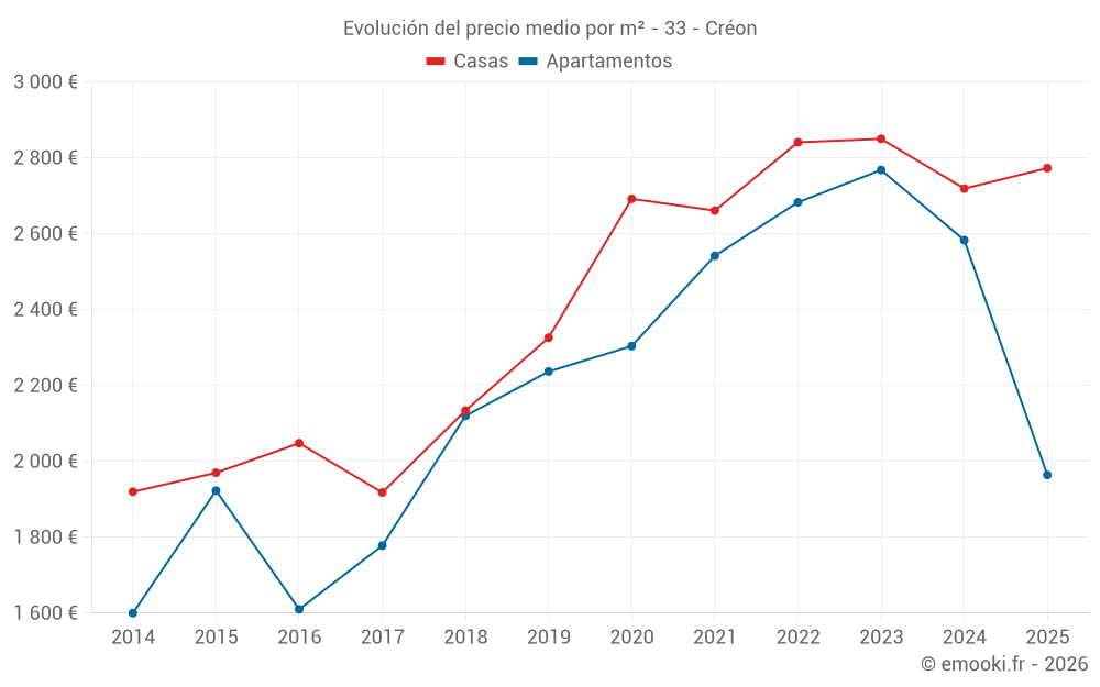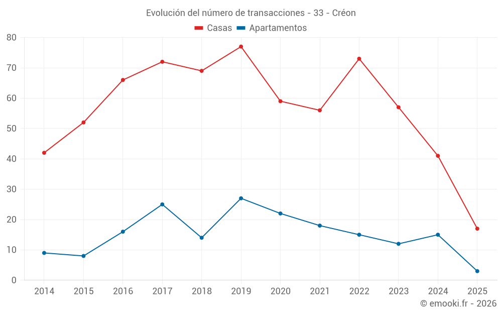 El precio mediano en las 22 transacciones de apartamentos de los últimos 24 meses en la comuna de Créon fue de 2 496 € por metro cuadrado para un valor patrimonial medio de 136 000 €. Durante este período el 60% de las transacciones estuvieron entre 2 133 y 2 945 € por metro cuadrado (del 2º al 8º decil).