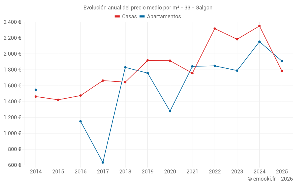 El precio mediano en las 23 transacciones de casas de los últimos 12 meses en la comuna de Galgon fue de 2 478 € por metro cuadrado para un valor patrimonial medio de 235 000 €. Durante este período el 60% de las transacciones estuvieron entre 1 773 y 2 788 € por metro cuadrado (del 2º al 8º decil).