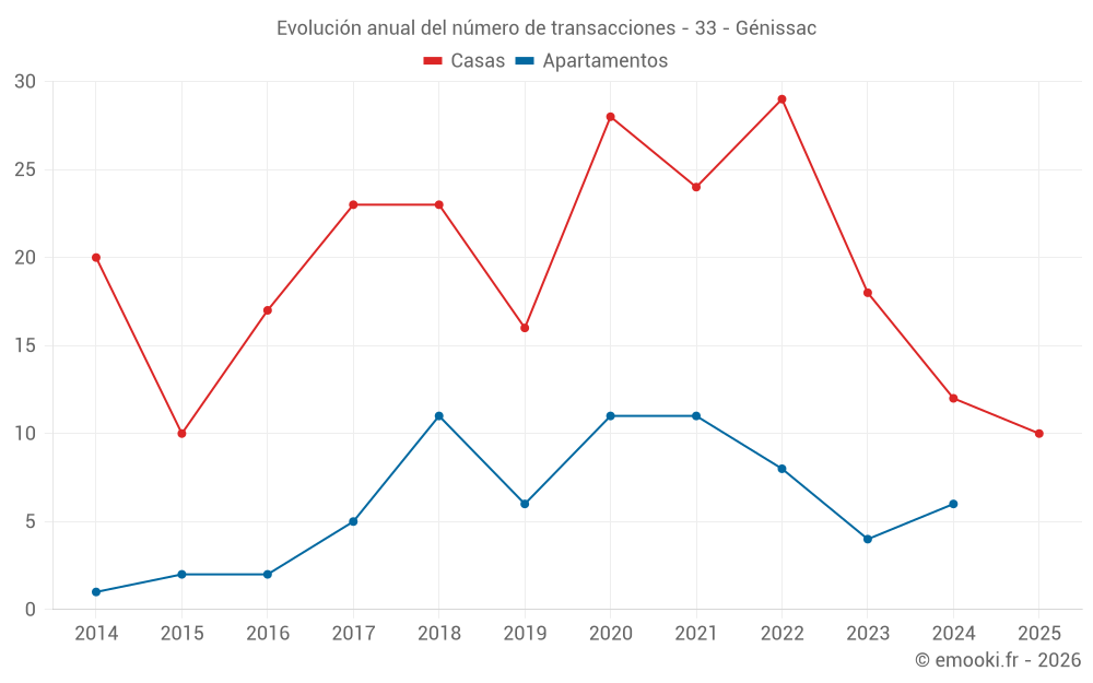 El precio mediano en las 19 transacciones de casas de los últimos 12 meses en la comuna de Génissac fue de 2 395 € por metro cuadrado para un valor patrimonial medio de 233 000 €. Durante este período el 60% de las transacciones estuvieron entre 1 760 y 2 662 € por metro cuadrado (del 2º al 8º decil).