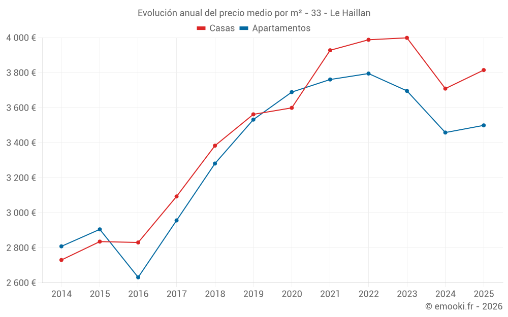 El precio mediano en las 46 transacciones de apartamentos de los últimos 6 meses en la comuna de Le Haillan fue de 3 500 € por metro cuadrado para un valor patrimonial medio de 159 000 €. Durante este período el 60% de las transacciones estuvieron entre 3 029 y 4 019 € por metro cuadrado (del 2º al 8º decil).