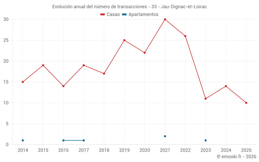 El precio mediano en las 17 transacciones de casas de los últimos 12 meses en la comuna de Jau-Dignac-et-Loirac fue de 1 917 € por metro cuadrado para un valor patrimonial medio de 162 000 €. Durante este período el 60% de las transacciones estuvieron entre 943 y 2 630 € por metro cuadrado (del 2º al 8º decil).