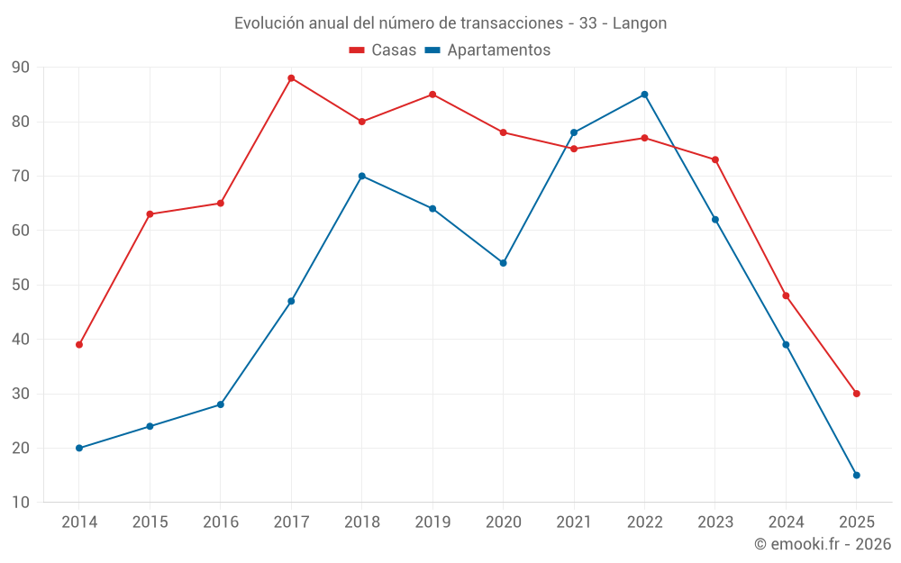 El precio mediano en las 35 transacciones de apartamentos de los últimos 12 meses en la comuna de Langon fue de 2 068 € por metro cuadrado para un valor patrimonial medio de 115 000 €. Durante este período el 60% de las transacciones estuvieron entre 1 680 y 2 290 € por metro cuadrado (del 2º al 8º decil).