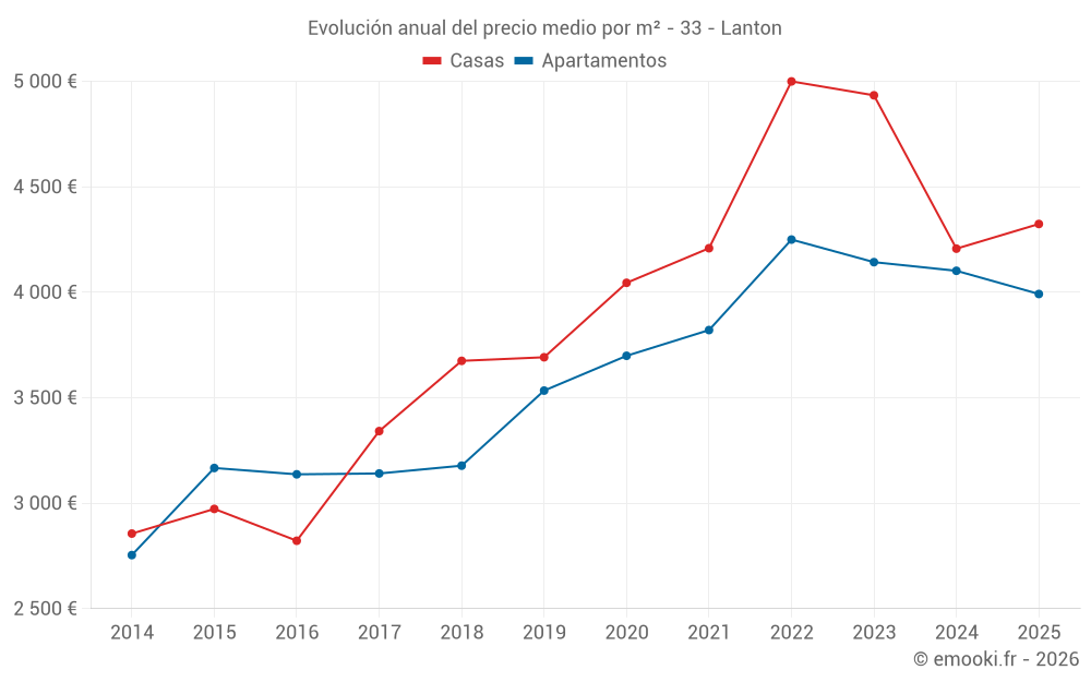 El precio mediano en las 40 transacciones de casas de los últimos 6 meses en la comuna de Lanton fue de 4 324 € por metro cuadrado para un valor patrimonial medio de 344 375 €. Durante este período el 60% de las transacciones estuvieron entre 3 395 y 5 000 € por metro cuadrado (del 2º al 8º decil).