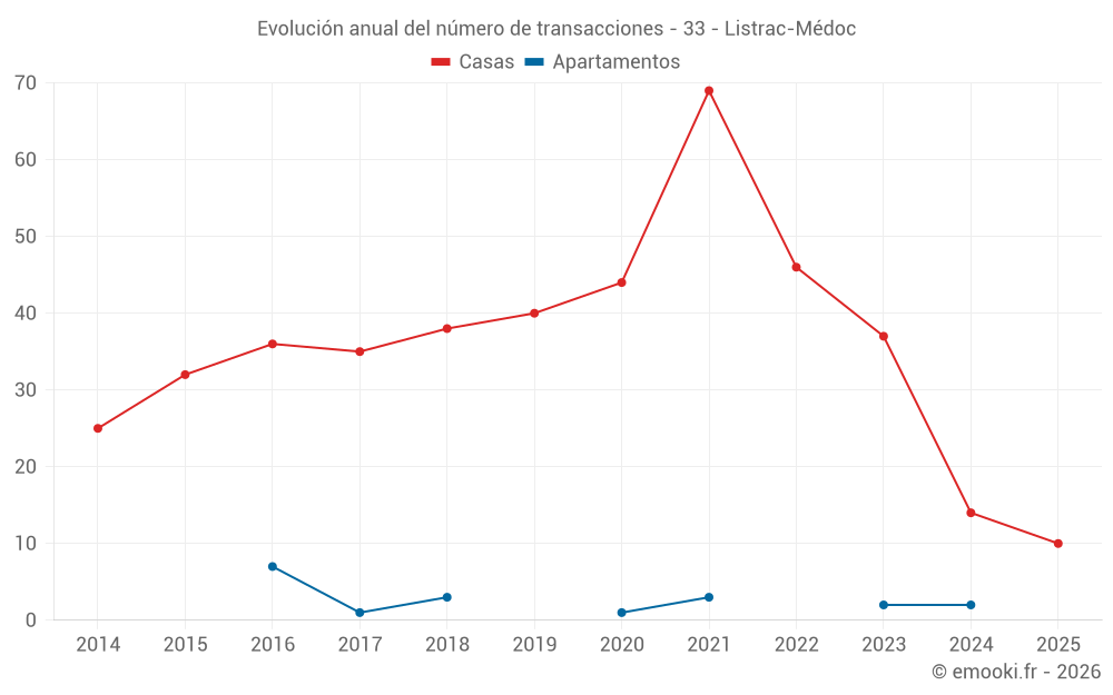El precio mediano en las 19 transacciones de casas de los últimos 12 meses en la comuna de Listrac-Médoc fue de 2 351 € por metro cuadrado para un valor patrimonial medio de 204 800 €. Durante este período el 60% de las transacciones estuvieron entre 1 412 y 2 732 € por metro cuadrado (del 2º al 8º decil).