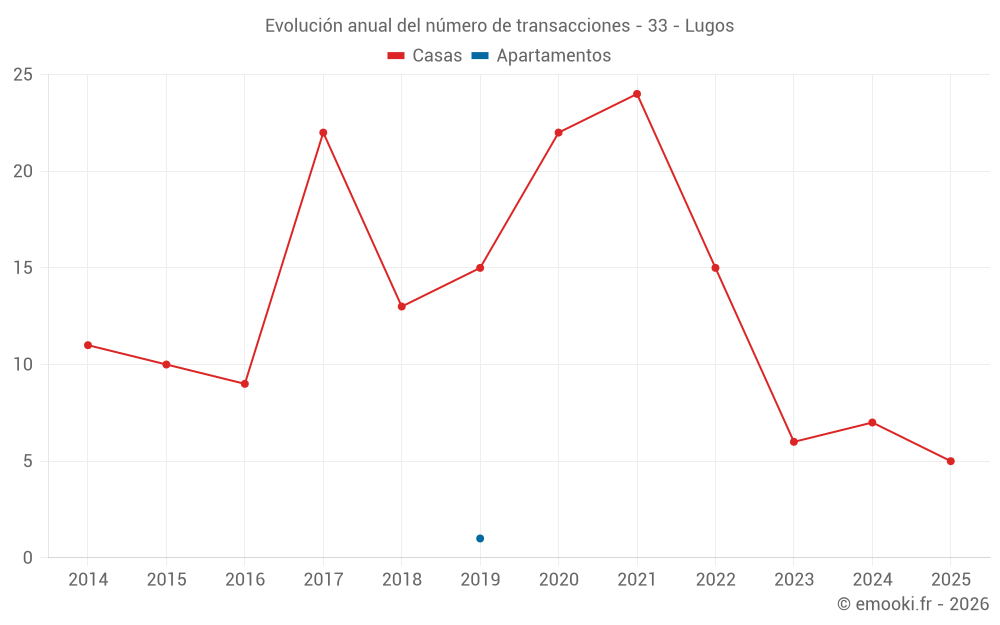 El precio mediano en las 18 transacciones de casas de los últimos 24 meses en la comuna de Lugos fue de 2 812 € por metro cuadrado para un valor patrimonial medio de 310 000 €. Durante este período el 60% de las transacciones estuvieron entre 1 797 y 3 555 € por metro cuadrado (del 2º al 8º decil).