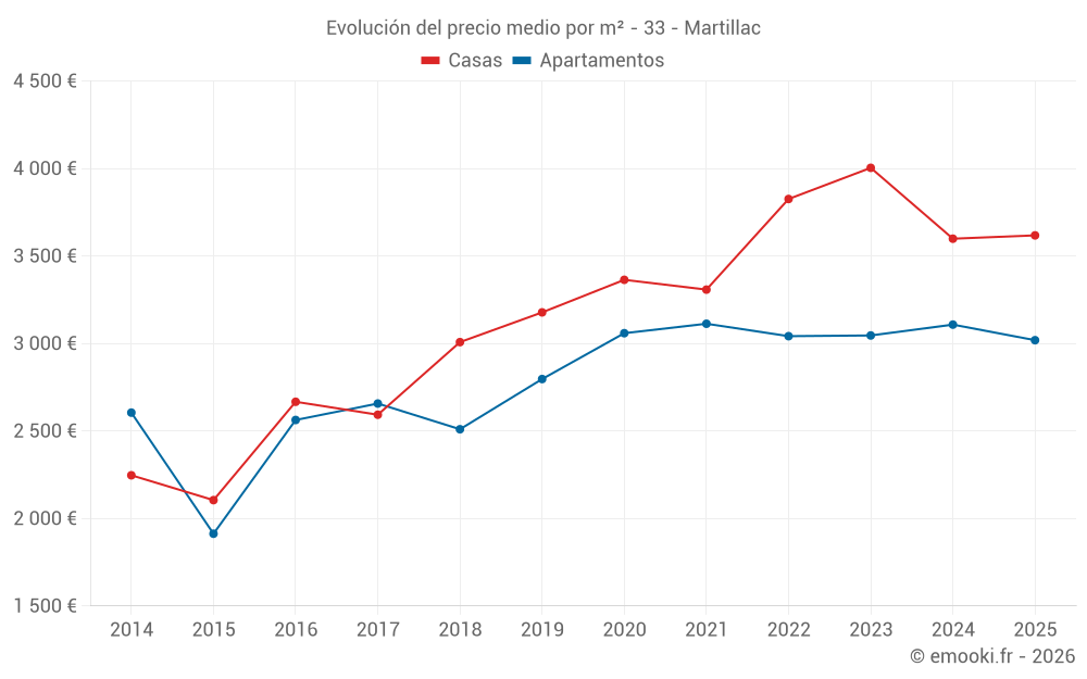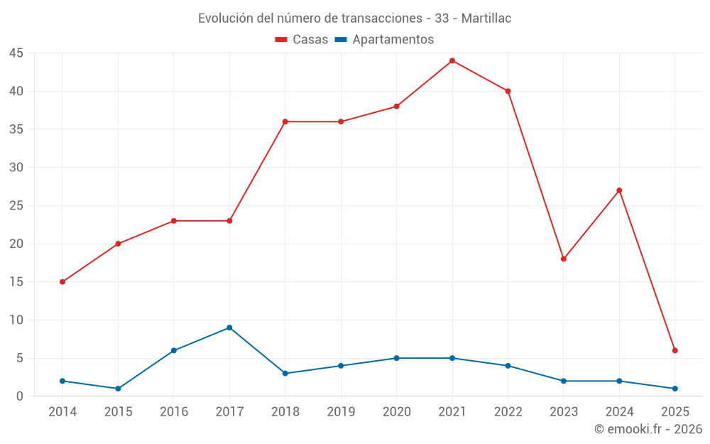 El precio mediano en las 23 transacciones de casas de los últimos 12 meses en la comuna de Martillac fue de 3 605 € por metro cuadrado para un valor patrimonial medio de 379 957 €. Durante este período el 60% de las transacciones estuvieron entre 3 234 y 3 887 € por metro cuadrado (del 2º al 8º decil).