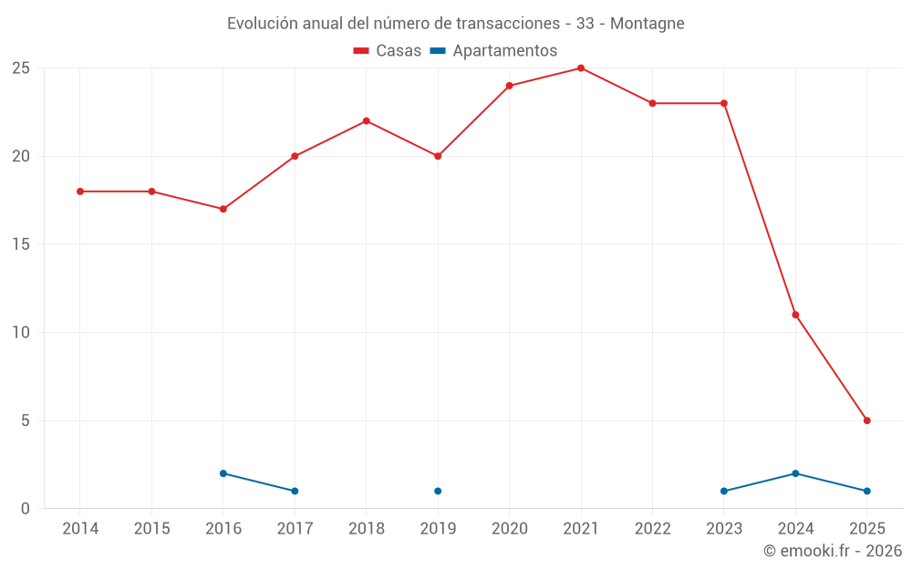 El precio mediano en las 26 transacciones de casas de los últimos 24 meses en la comuna de Montagne fue de 2 112 € por metro cuadrado para un valor patrimonial medio de 265 752 €. Durante este período el 60% de las transacciones estuvieron entre 986 y 2 824 € por metro cuadrado (del 2º al 8º decil).
