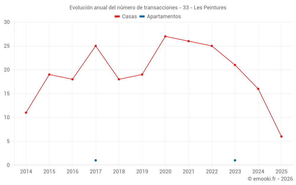 El precio mediano en las 18 transacciones de casas de los últimos 12 meses en la comuna de Les Peintures fue de 1 199 € por metro cuadrado para un valor patrimonial medio de 136 500 €. Durante este período el 60% de las transacciones estuvieron entre 571 y 1 964 € por metro cuadrado (del 2º al 8º decil).