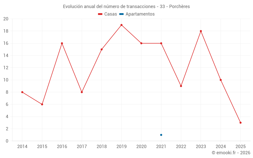 El precio mediano en las 20 transacciones de casas de los últimos 24 meses en la comuna de Porchères fue de 1 938 € por metro cuadrado para un valor patrimonial medio de 190 030 €. Durante este período el 60% de las transacciones estuvieron entre 1 189 y 2 079 € por metro cuadrado (del 2º al 8º decil).