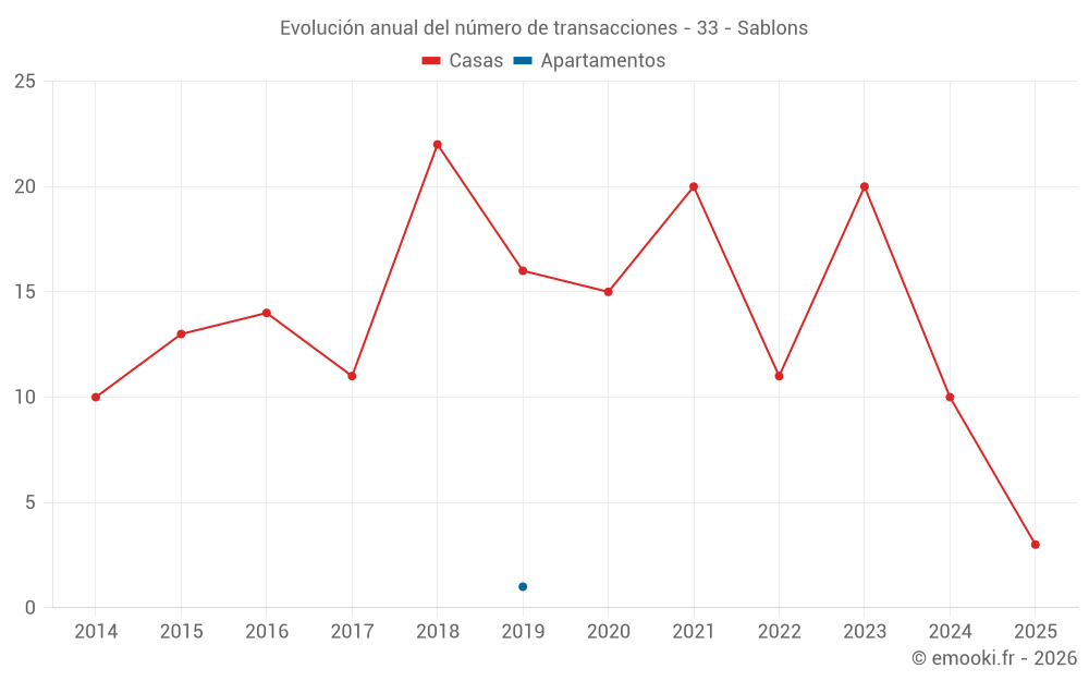 El precio mediano en las 23 transacciones de casas de los últimos 24 meses en la comuna de Sablons fue de 1 570 € por metro cuadrado para un valor patrimonial medio de 155 000 €. Durante este período el 60% de las transacciones estuvieron entre 1 304 y 2 531 € por metro cuadrado (del 2º al 8º decil).