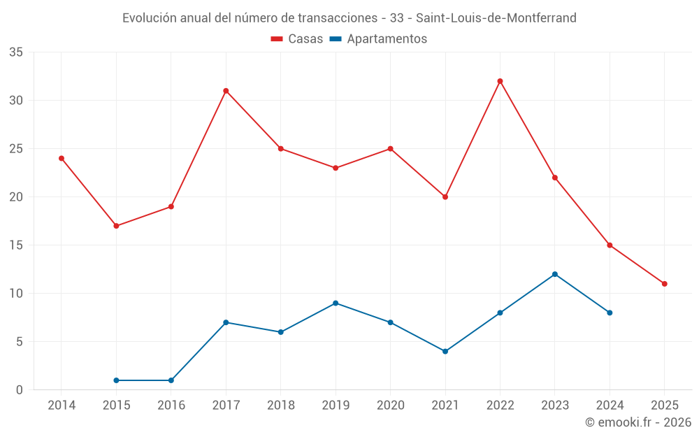 El precio mediano en las 14 transacciones de apartamentos de los últimos 24 meses en la comuna de Saint-Louis-de-Montferrand fue de 2 530 € por metro cuadrado para un valor patrimonial medio de 110 448 €. Durante este período el 60% de las transacciones estuvieron entre 2 203 y 3 092 € por metro cuadrado (del 2º al 8º decil).