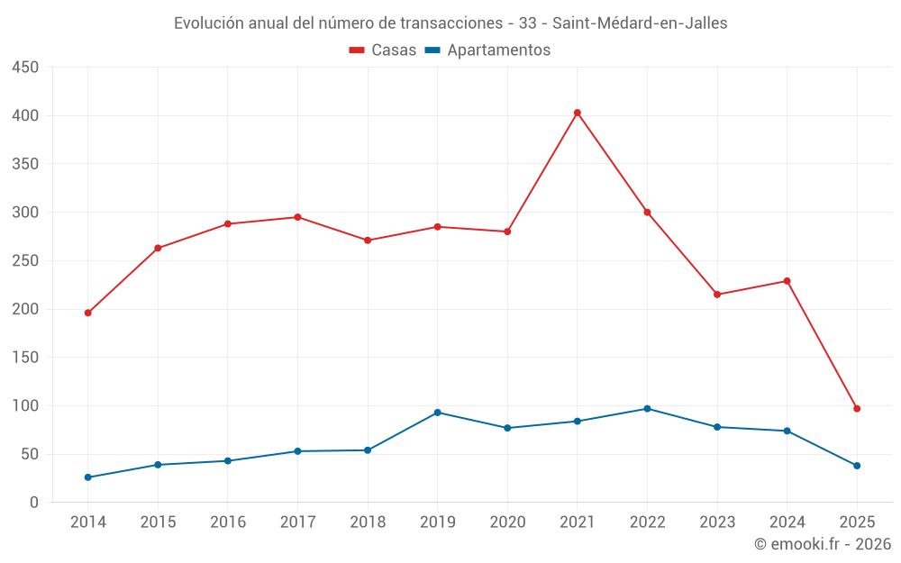 El precio mediano en las 38 transacciones de apartamentos de los últimos 6 meses en la comuna de Saint-Médard-en-Jalles fue de 3 308 € por metro cuadrado para un valor patrimonial medio de 184 500 €. Durante este período el 60% de las transacciones estuvieron entre 3 072 y 3 907 € por metro cuadrado (del 2º al 8º decil).