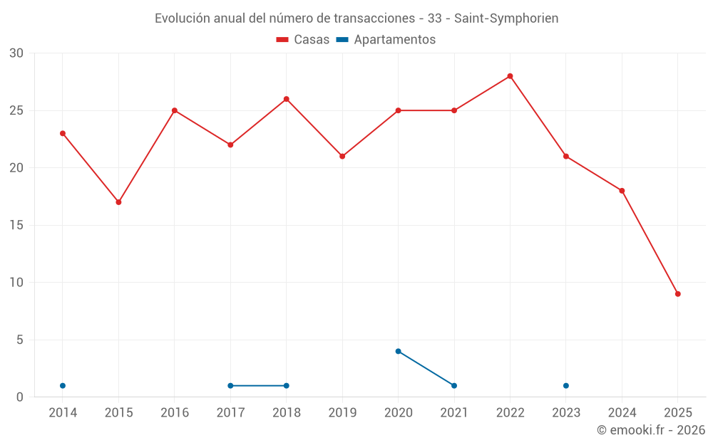 El precio mediano en las 19 transacciones de casas de los últimos 12 meses en la comuna de Saint-Symphorien fue de 1 885 € por metro cuadrado para un valor patrimonial medio de 190 000 €. Durante este período el 60% de las transacciones estuvieron entre 1 458 y 2 964 € por metro cuadrado (del 2º al 8º decil).