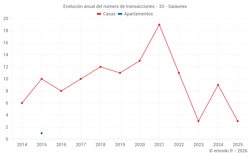 El precio mediano en las 15 transacciones de casas de los últimos 24 meses en la comuna de Salaunes fue de 3 554 € por metro cuadrado para un valor patrimonial medio de 398 000 €. Durante este período el 60% de las transacciones estuvieron entre 3 099 y 4 188 € por metro cuadrado (del 2º al 8º decil).