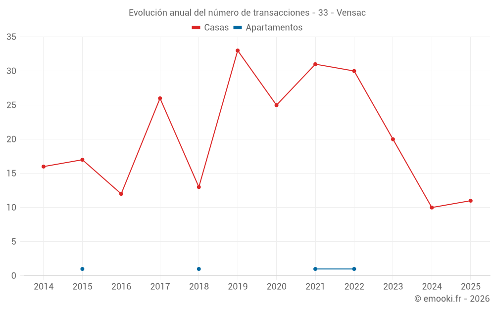 El precio mediano en las 30 transacciones de casas de los últimos 24 meses en la comuna de Vensac fue de 2 552 € por metro cuadrado para un valor patrimonial medio de 213 970 €. Durante este período el 60% de las transacciones estuvieron entre 1 536 y 3 372 € por metro cuadrado (del 2º al 8º decil).