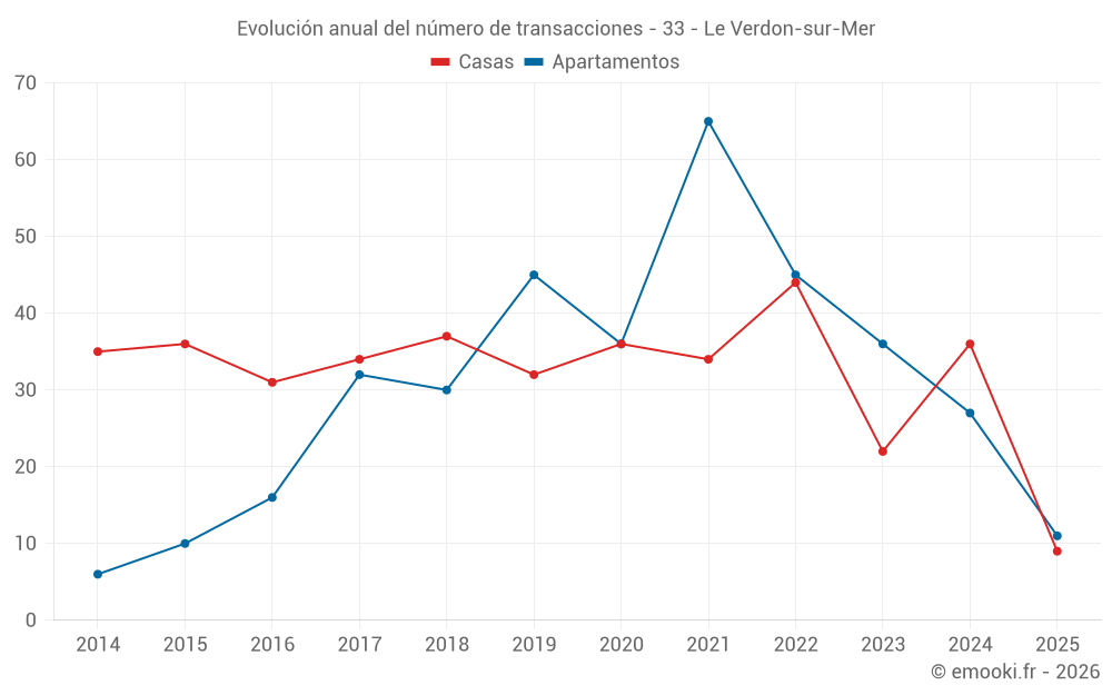 El precio mediano en las 29 transacciones de apartamentos de los últimos 12 meses en la comuna de Le Verdon-sur-Mer fue de 2 397 € por metro cuadrado para un valor patrimonial medio de 103 000 €. Durante este período el 60% de las transacciones estuvieron entre 1 724 y 2 797 € por metro cuadrado (del 2º al 8º decil).