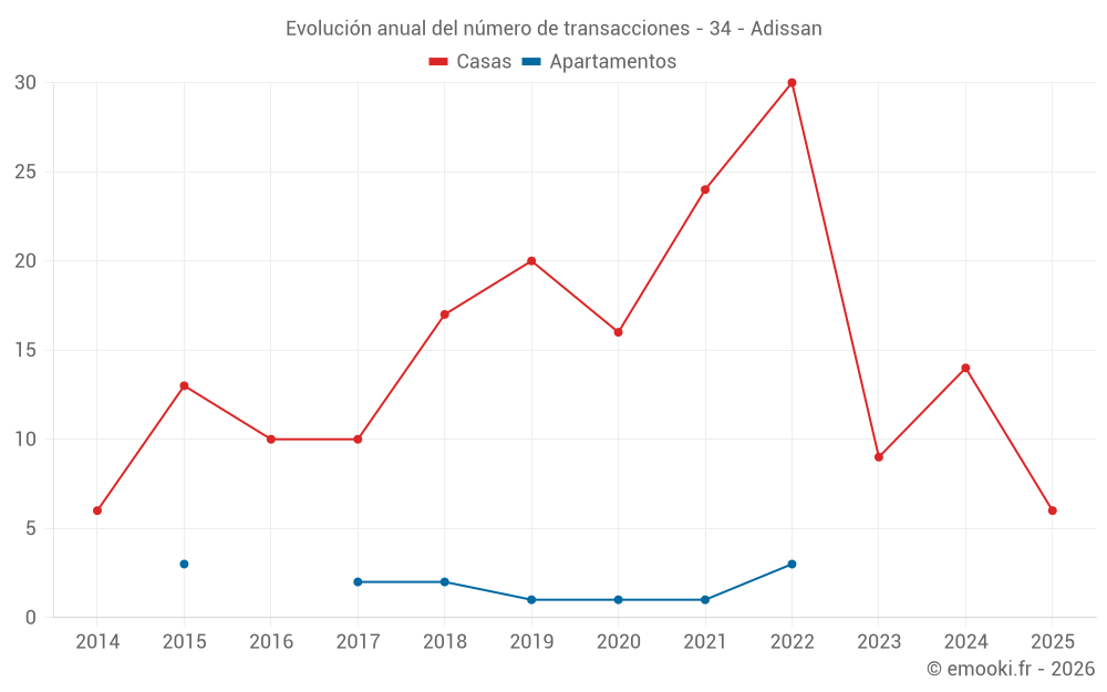 El precio mediano en las 23 transacciones de casas de los últimos 24 meses en la comuna de Adissan fue de 2 800 € por metro cuadrado para un valor patrimonial medio de 225 000 €. Durante este período el 60% de las transacciones estuvieron entre 1 590 y 3 207 € por metro cuadrado (del 2º al 8º decil).