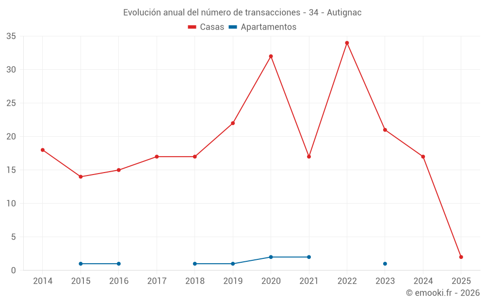 El precio mediano en las 29 transacciones de casas de los últimos 24 meses en la comuna de Autignac fue de 1 702 € por metro cuadrado para un valor patrimonial medio de 130 000 €. Durante este período el 60% de las transacciones estuvieron entre 779 y 2 855 € por metro cuadrado (del 2º al 8º decil).