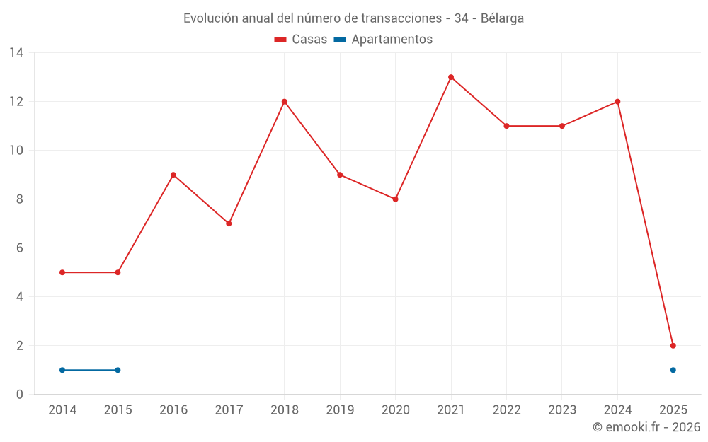 El precio mediano en las 20 transacciones de casas de los últimos 24 meses en la comuna de Bélarga fue de 2 910 € por metro cuadrado para un valor patrimonial medio de 283 450 €. Durante este período el 60% de las transacciones estuvieron entre 2 035 y 3 248 € por metro cuadrado (del 2º al 8º decil).