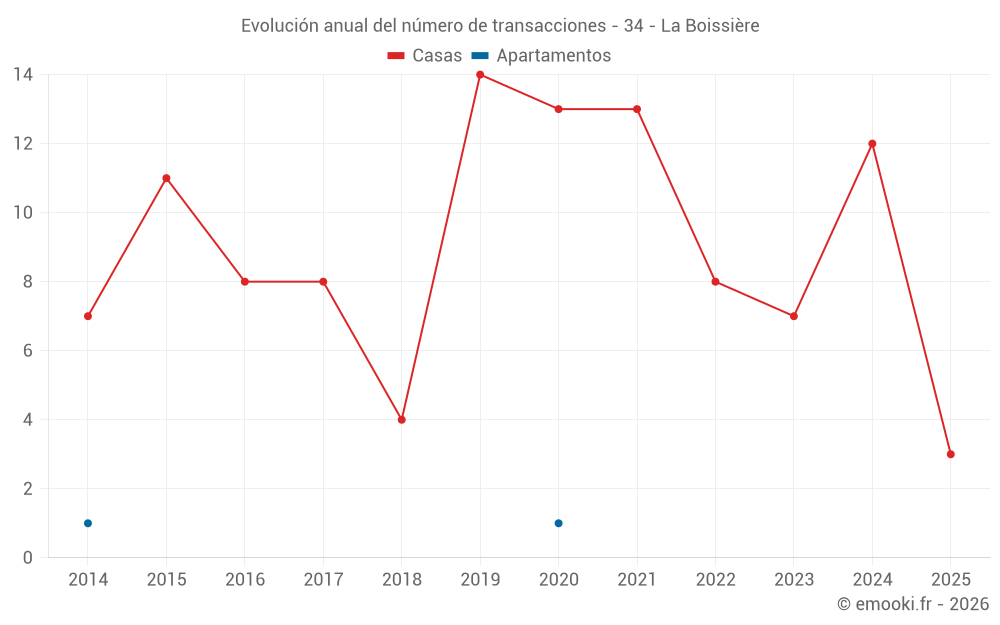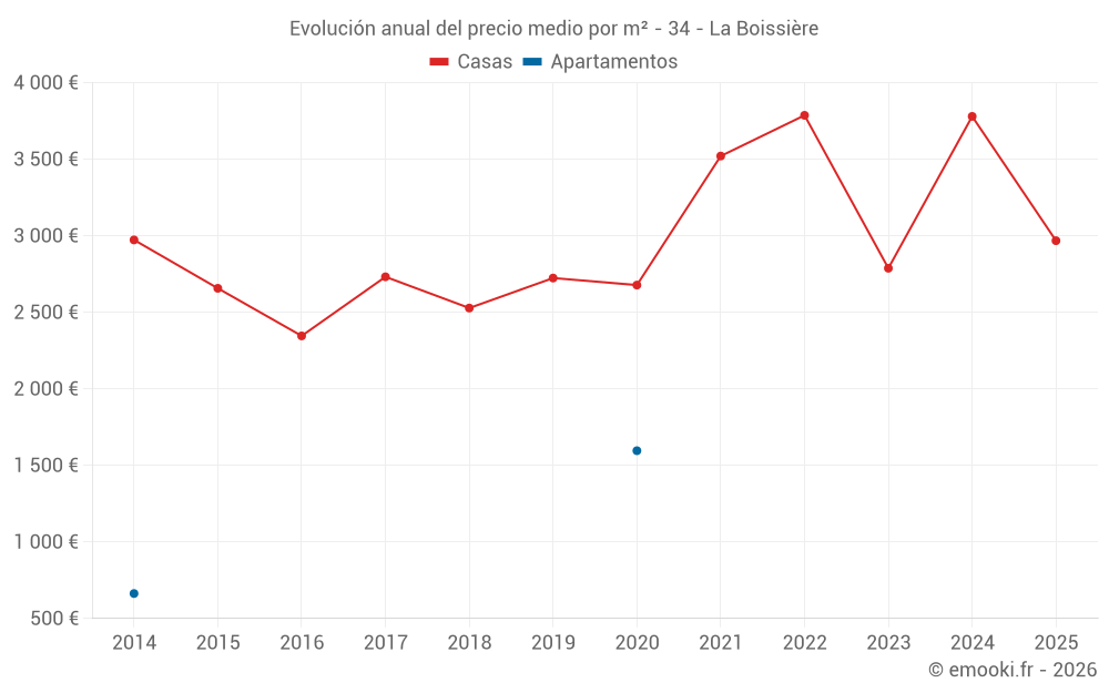 El precio mediano en las 17 transacciones de casas de los últimos 24 meses en la comuna de La Boissière fue de 3 385 € por metro cuadrado para un valor patrimonial medio de 394 700 €. Durante este período el 60% de las transacciones estuvieron entre 2 633 y 4 177 € por metro cuadrado (del 2º al 8º decil).