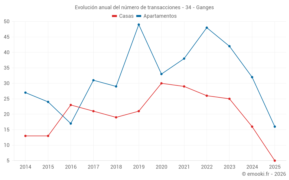 El precio mediano en las 18 transacciones de casas de los últimos 12 meses en la comuna de Ganges fue de 2 304 € por metro cuadrado para un valor patrimonial medio de 174 400 €. Durante este período el 60% de las transacciones estuvieron entre 1 629 y 2 800 € por metro cuadrado (del 2º al 8º decil).