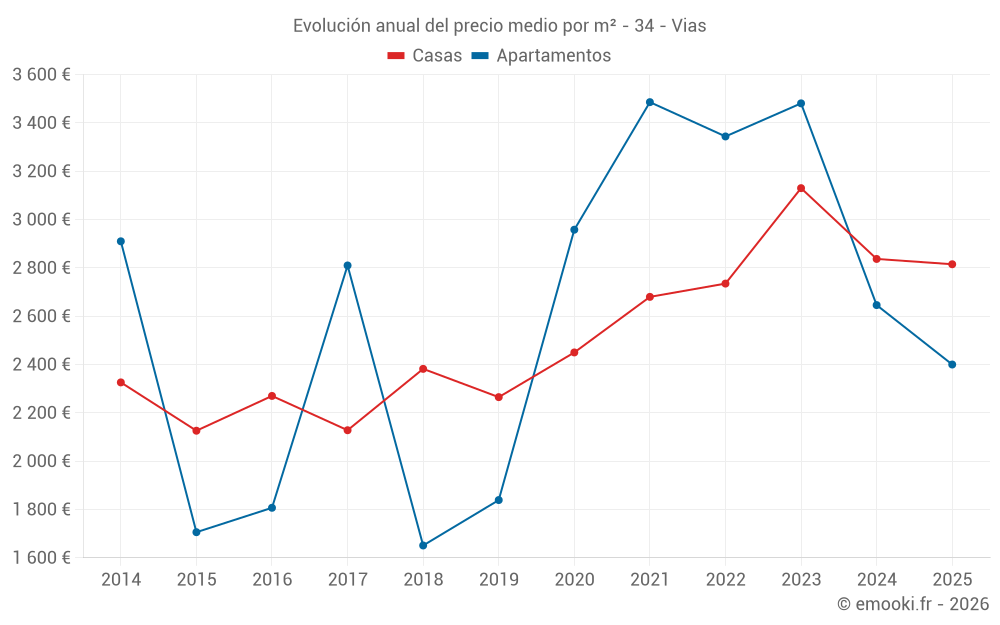 El precio mediano en las 38 transacciones de apartamentos de los últimos 12 meses en la comuna de Vias fue de 2 616 € por metro cuadrado para un valor patrimonial medio de 165 750 €. Durante este período el 60% de las transacciones estuvieron entre 1 630 y 4 200 € por metro cuadrado (del 2º al 8º decil).