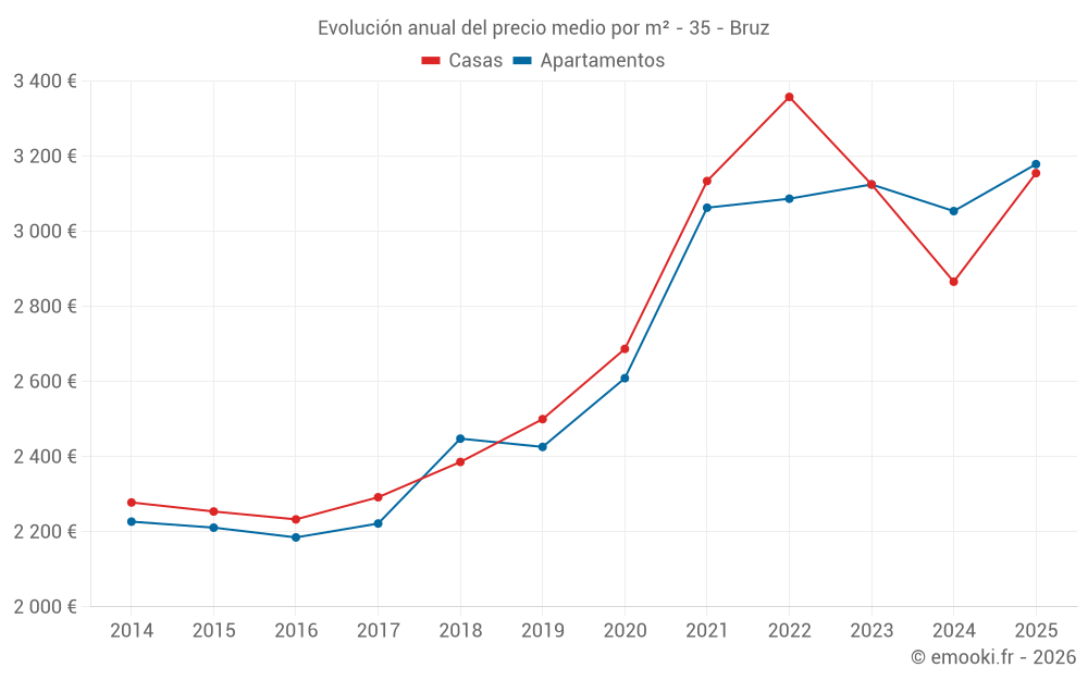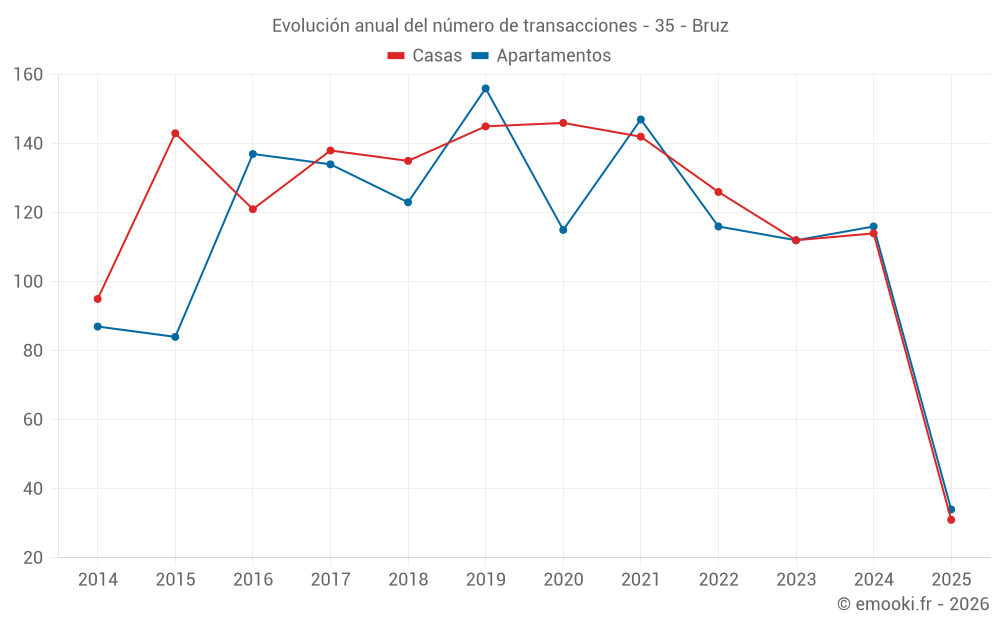El precio mediano en las 34 transacciones de apartamentos de los últimos 6 meses en la comuna de Bruz fue de 3 179 € por metro cuadrado para un valor patrimonial medio de 157 972 €. Durante este período el 60% de las transacciones estuvieron entre 2 275 y 3 653 € por metro cuadrado (del 2º al 8º decil).