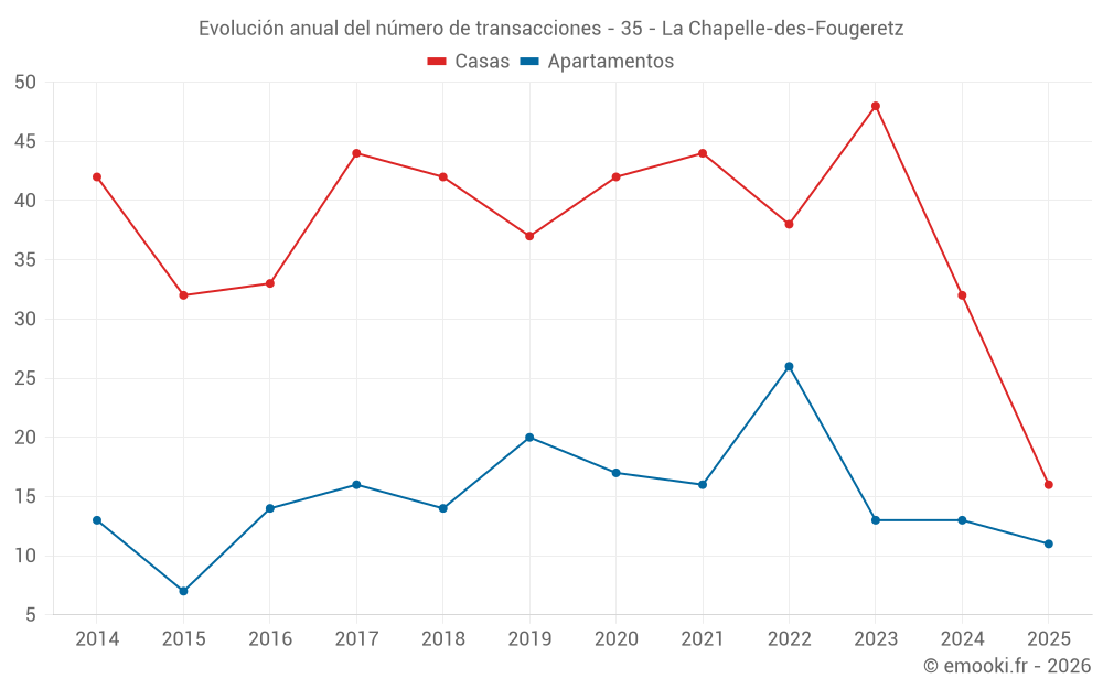 El precio mediano en las 32 transacciones de casas de los últimos 12 meses en la comuna de La Chapelle-des-Fougeretz fue de 3 166 € por metro cuadrado para un valor patrimonial medio de 318 382 €. Durante este período el 60% de las transacciones estuvieron entre 2 810 y 3 665 € por metro cuadrado (del 2º al 8º decil).