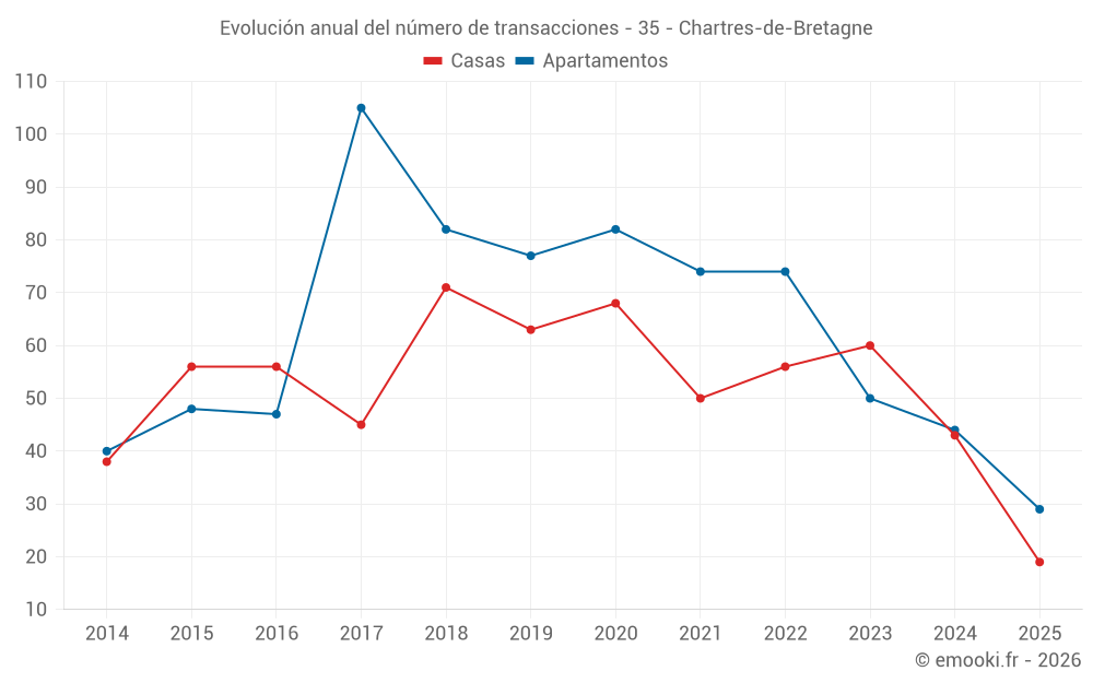 El precio mediano en las 19 transacciones de casas de los últimos 6 meses en la comuna de Chartres-de-Bretagne fue de 2 947 € por metro cuadrado para un valor patrimonial medio de 290 000 €. Durante este período el 60% de las transacciones estuvieron entre 2 493 y 3 340 € por metro cuadrado (del 2º al 8º decil).