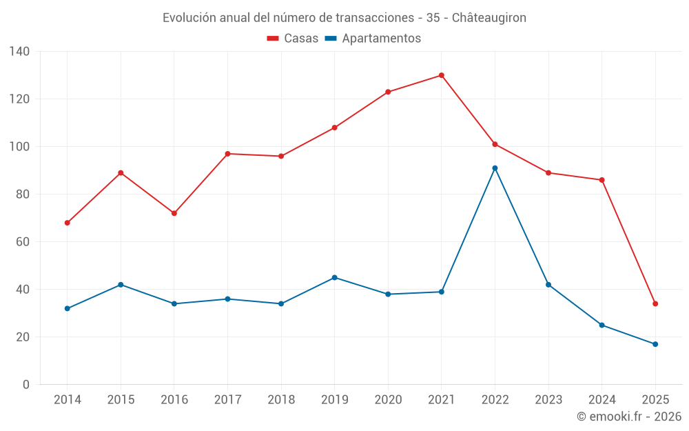 El precio mediano en las 34 transacciones de casas de los últimos 6 meses en la comuna de Châteaugiron fue de 2 726 € por metro cuadrado para un valor patrimonial medio de 292 650 €. Durante este período el 60% de las transacciones estuvieron entre 2 348 y 3 029 € por metro cuadrado (del 2º al 8º decil).