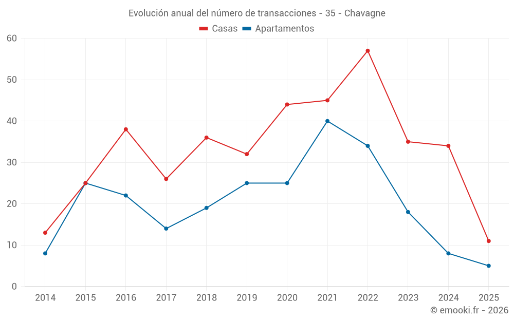 El precio mediano en las 21 transacciones de apartamentos de los últimos 24 meses en la comuna de Chavagne fue de 2 905 € por metro cuadrado para un valor patrimonial medio de 180 100 €. Durante este período el 60% de las transacciones estuvieron entre 2 553 y 3 071 € por metro cuadrado (del 2º al 8º decil).