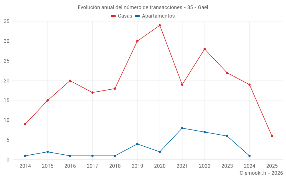 El precio mediano en las 34 transacciones de casas de los últimos 24 meses en la comuna de Gaël fue de 1 357 € por metro cuadrado para un valor patrimonial medio de 143 750 €. Durante este período el 60% de las transacciones estuvieron entre 818 y 1 685 € por metro cuadrado (del 2º al 8º decil).