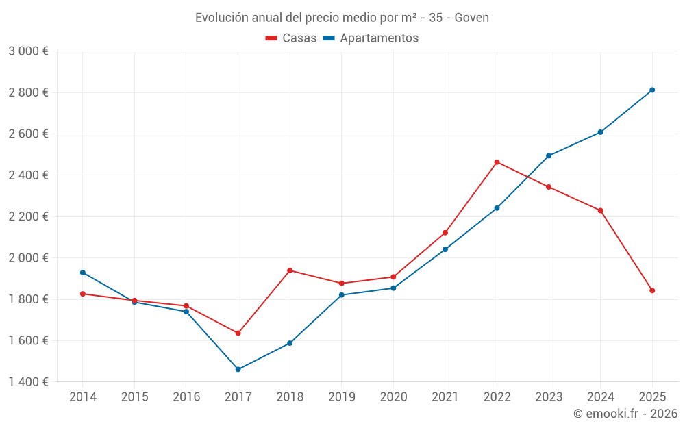 El precio mediano en las 34 transacciones de casas de los últimos 12 meses en la comuna de Goven fue de 2 148 € por metro cuadrado para un valor patrimonial medio de 231 140 €. Durante este período el 60% de las transacciones estuvieron entre 1 688 y 2 606 € por metro cuadrado (del 2º al 8º decil).