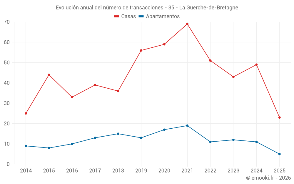 El precio mediano en las 23 transacciones de casas de los últimos 6 meses en la comuna de La Guerche-de-Bretagne fue de 1 707 € por metro cuadrado para un valor patrimonial medio de 158 305 €. Durante este período el 60% de las transacciones estuvieron entre 1 299 y 2 042 € por metro cuadrado (del 2º al 8º decil).
