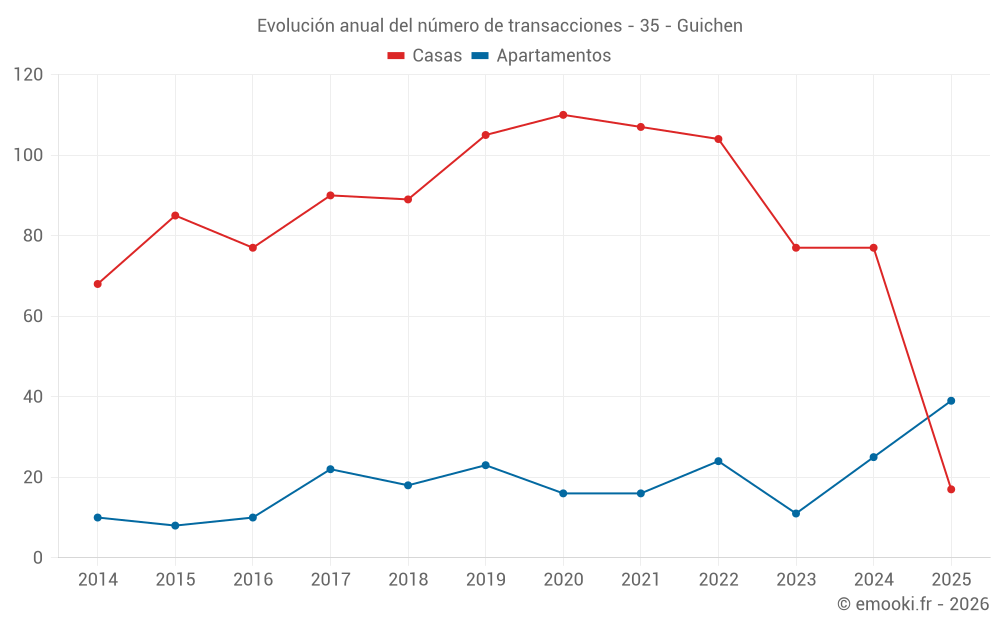 El precio mediano en las 39 transacciones de apartamentos de los últimos 6 meses en la comuna de Guichen fue de 2 612 € por metro cuadrado para un valor patrimonial medio de 168 000 €. Durante este período el 60% de las transacciones estuvieron entre 2 434 y 2 678 € por metro cuadrado (del 2º al 8º decil).