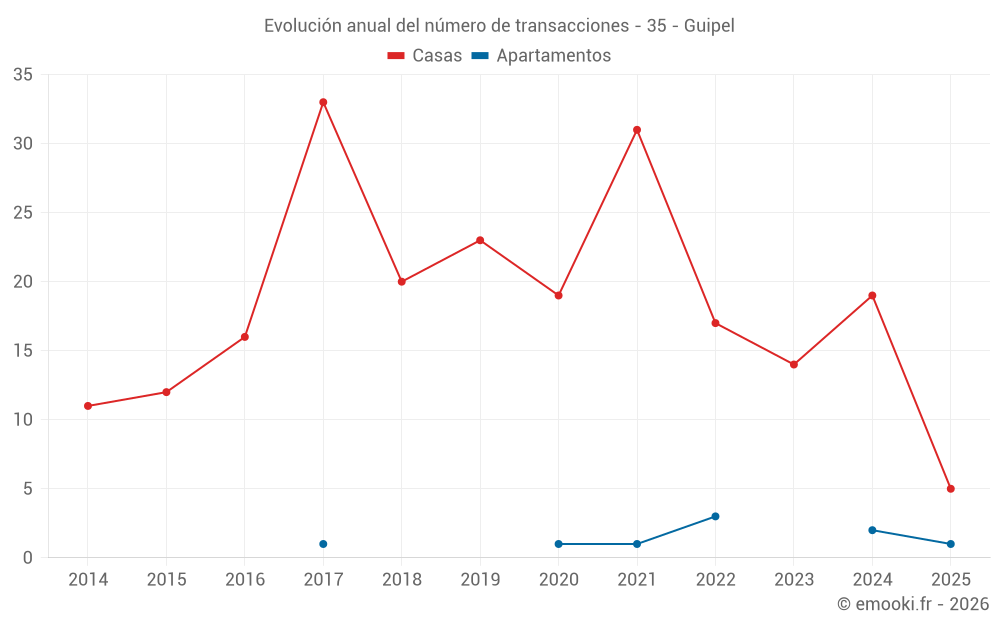 El precio mediano en las 16 transacciones de casas de los últimos 12 meses en la comuna de Guipel fue de 2 038 € por metro cuadrado para un valor patrimonial medio de 132 500 €. Durante este período el 60% de las transacciones estuvieron entre 1 288 y 2 190 € por metro cuadrado (del 2º al 8º decil).