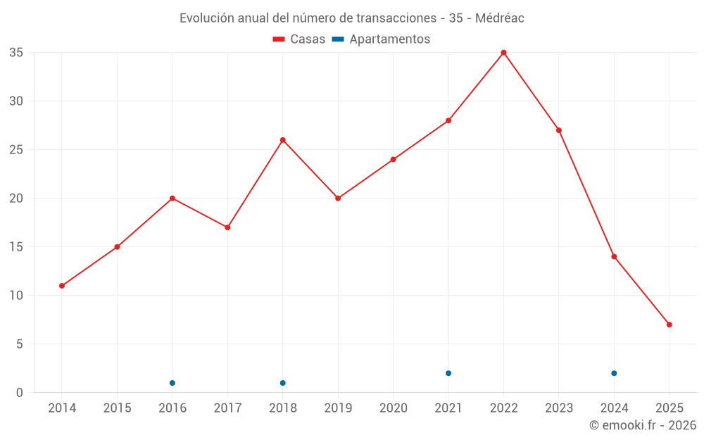 El precio mediano en las 36 transacciones de casas de los últimos 24 meses en la comuna de Médréac fue de 1 662 € por metro cuadrado para un valor patrimonial medio de 173 000 €. Durante este período el 60% de las transacciones estuvieron entre 1 318 y 2 143 € por metro cuadrado (del 2º al 8º decil).