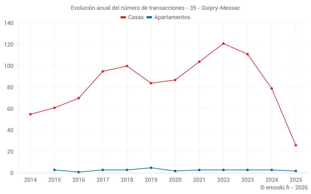 El precio mediano en las 26 transacciones de casas de los últimos 6 meses en la comuna de Guipry-Messac fue de 1 926 € por metro cuadrado para un valor patrimonial medio de 169 400 €. Durante este período el 60% de las transacciones estuvieron entre 1 328 y 2 208 € por metro cuadrado (del 2º al 8º decil).