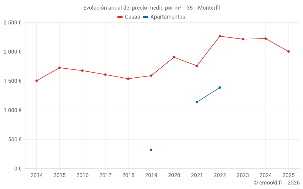 El precio mediano en las 29 transacciones de casas de los últimos 24 meses en la comuna de Monterfil fue de 2 292 € por metro cuadrado para un valor patrimonial medio de 229 000 €. Durante este período el 60% de las transacciones estuvieron entre 1 616 y 2 822 € por metro cuadrado (del 2º al 8º decil).