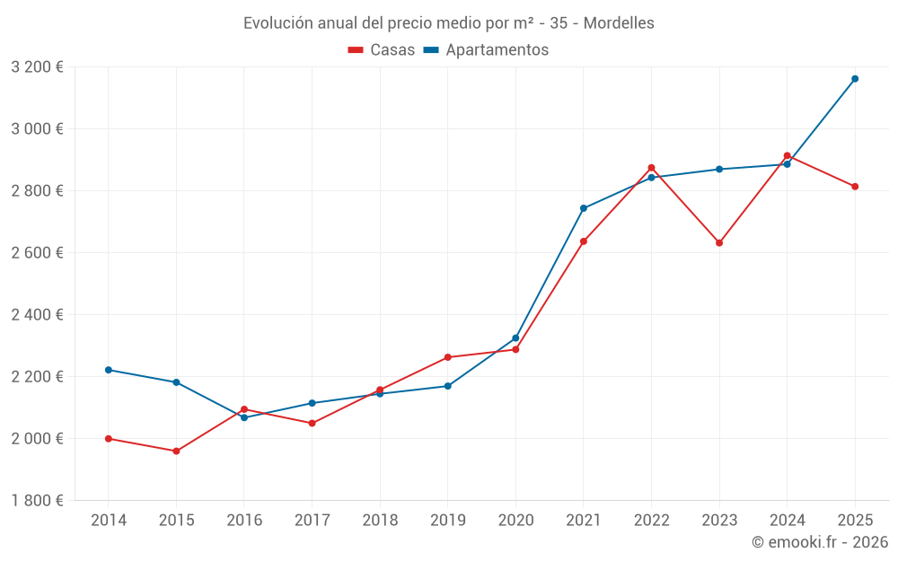 El precio mediano en las 25 transacciones de apartamentos de los últimos 6 meses en la comuna de Mordelles fue de 3 162 € por metro cuadrado para un valor patrimonial medio de 160 000 €. Durante este período el 60% de las transacciones estuvieron entre 2 844 y 3 354 € por metro cuadrado (del 2º al 8º decil).