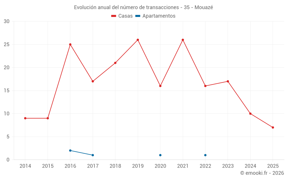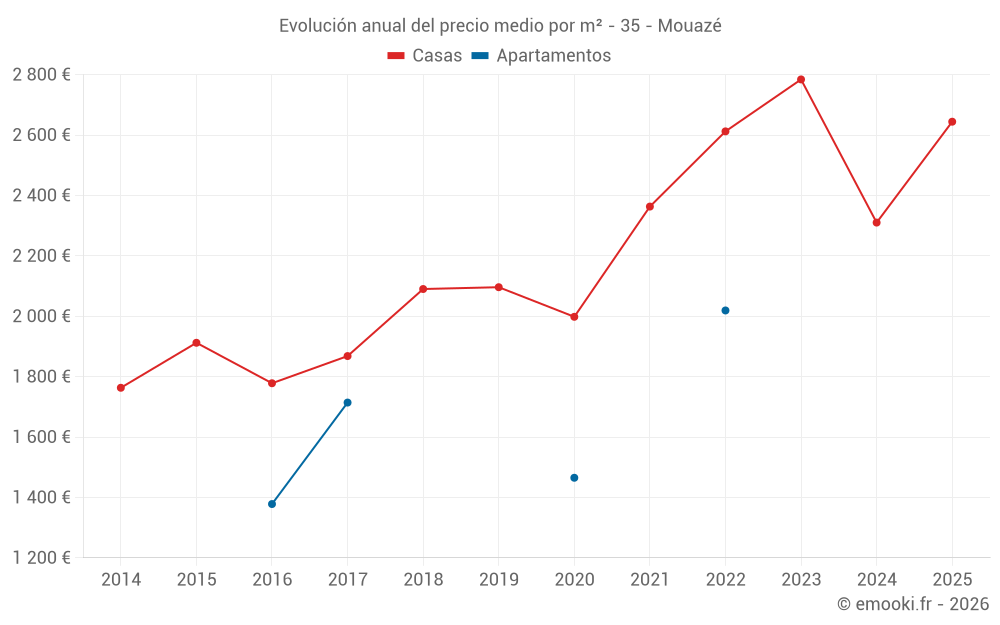 El precio mediano en las 27 transacciones de casas de los últimos 24 meses en la comuna de Mouazé fue de 2 579 € por metro cuadrado para un valor patrimonial medio de 250 000 €. Durante este período el 60% de las transacciones estuvieron entre 2 139 y 2 919 € por metro cuadrado (del 2º al 8º decil).
