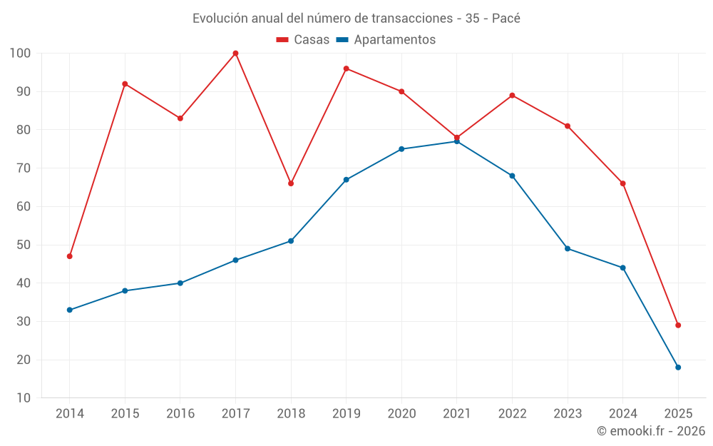 El precio mediano en las 18 transacciones de apartamentos de los últimos 6 meses en la comuna de Pacé fue de 3 425 € por metro cuadrado para un valor patrimonial medio de 217 050 €. Durante este período el 60% de las transacciones estuvieron entre 2 932 y 3 660 € por metro cuadrado (del 2º al 8º decil).
