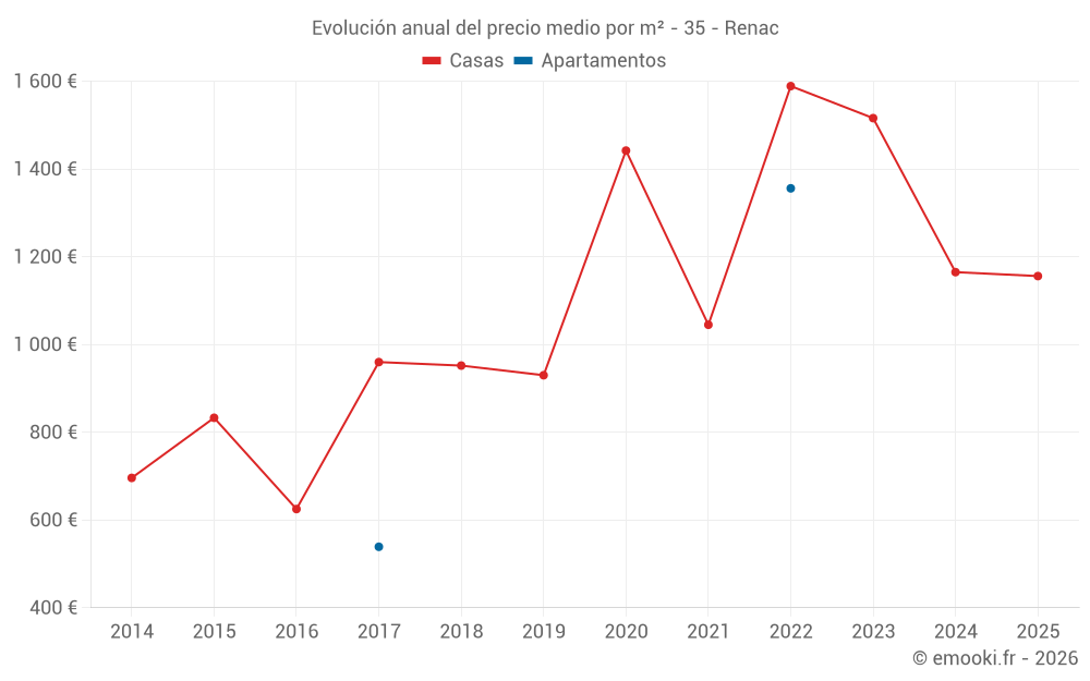 El precio mediano en las 22 transacciones de casas de los últimos 24 meses en la comuna de Renac fue de 1 213 € por metro cuadrado para un valor patrimonial medio de 120 000 €. Durante este período el 60% de las transacciones estuvieron entre 853 y 1 539 € por metro cuadrado (del 2º al 8º decil).
