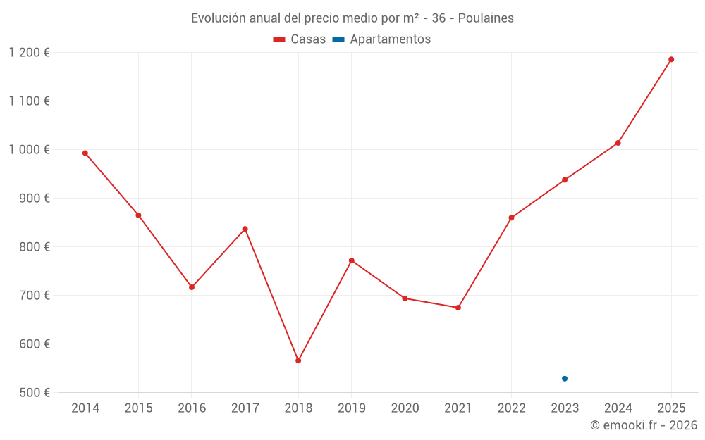 El precio mediano en las 26 transacciones de casas de los últimos 24 meses en la comuna de Poulaines fue de 982 € por metro cuadrado para un valor patrimonial medio de 68 500 €. Durante este período el 60% de las transacciones estuvieron entre 714 y 1 240 € por metro cuadrado (del 2º al 8º decil).